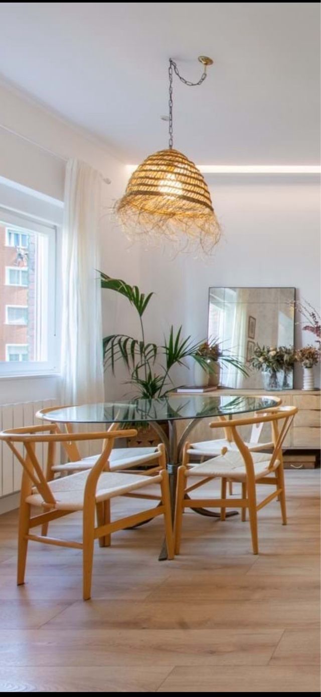 Detalles del productoPreciosa mesa de comedor redonda con sobre de cristal transparente y cuatro sillas de madera clara. Pie de hierro forjado acabado bronce muy resistente. Las sillas tienen asientos de fibra natural trenzada. Está en perfecto estado, listo para usar.
