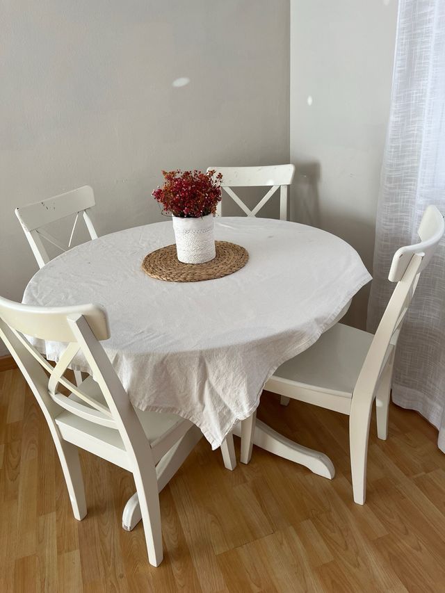 Detalles del productoConjunto de mesa redonda de ikea con cuatro sillas.