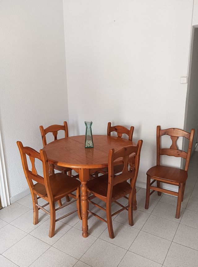 Detalles del productoConjunto de mesa redonda de madera de pino macizo con cinco sillas.