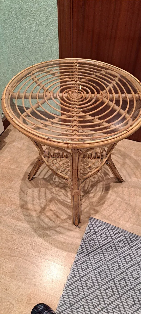 Mesa redonda y 2 sillas de mimbre