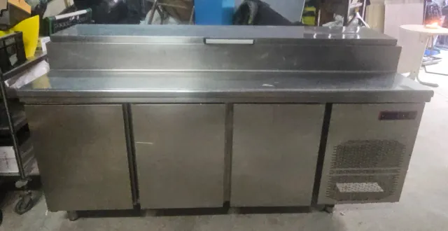 Detalles del productoMesa refrigerada de acero inoxidable con tres puertas, ideal para la preparación de enssldass y platoss frios.