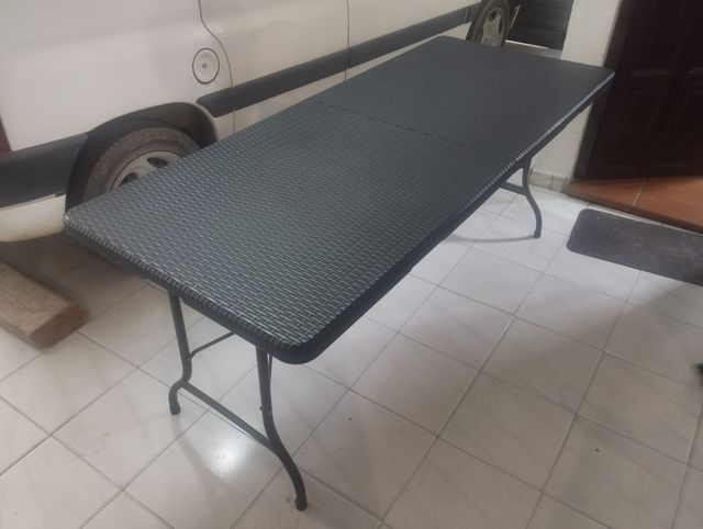 Detalles del productoMesa plegable de resina, para camping, playa, jardín celebraciónes, eventos, es de color oscura más limpia y elegante que las blancas, la superficie es imitación a ratán, pero no lo es. Medidas 1'77cm x 0'77 cm Medidas del producto