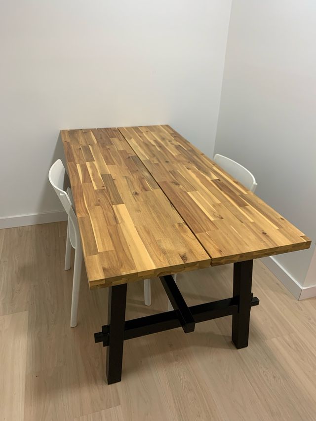 Mesa de comedor SKOGSTA de IKEA con un diseño moderno y robusto.