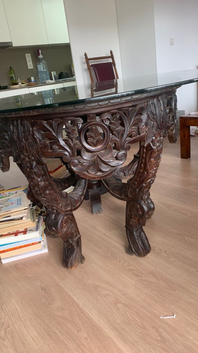 Mesa vintage madera y cristal tallada
