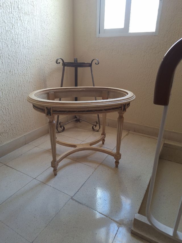 mesa-vitrina de madera estilo victoriano en color beige en perfecto estado, perfecta para colocar en cualquier rincón y meter alguna colección de objetos