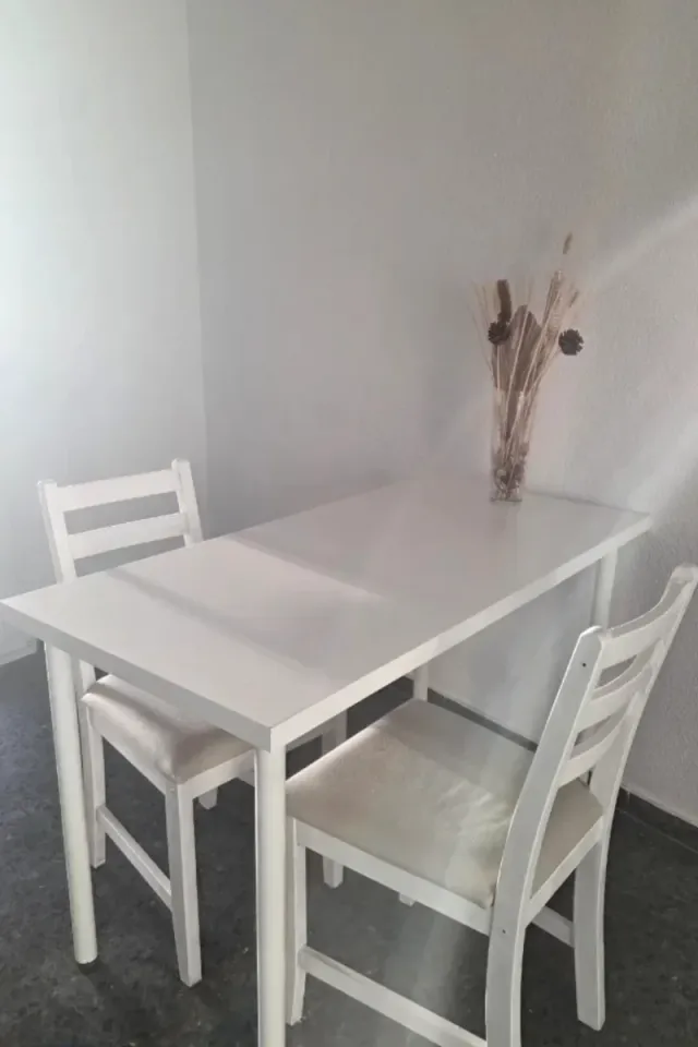 Detalles del productoConjunto de mesa y dos sillas de comedor en color blanco.