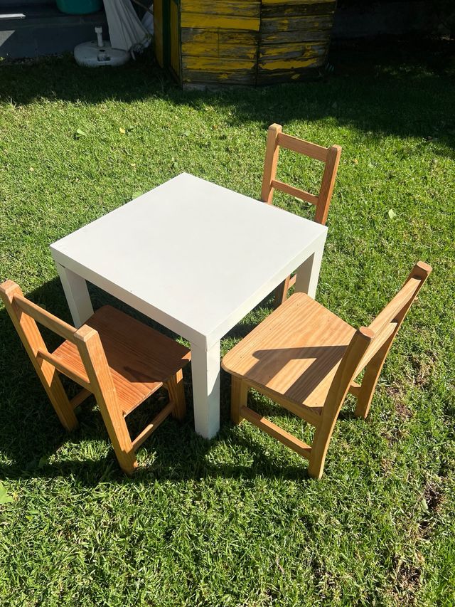 Conjunto de mesa y tres sillas de madera para niños. Ideal para jugar o estudiar. - Mesa cuadrada blanca. - Tres sillas de madera clara.