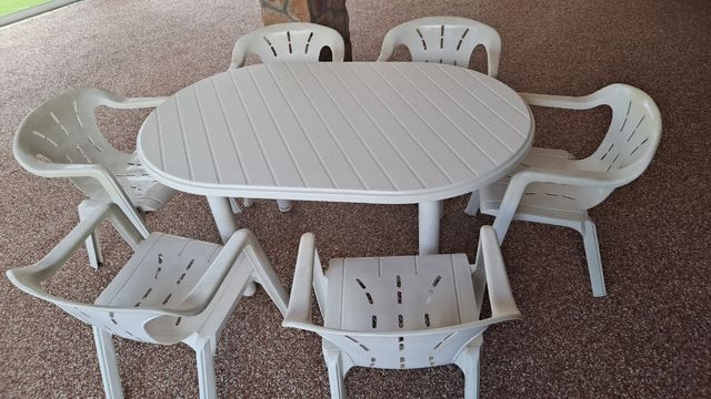 Detalles del productoPrecioso conjunto de mesa y seis sillas para jardín o terraza. Son de plástico, de color blanco roto, y están en muy buen estado.