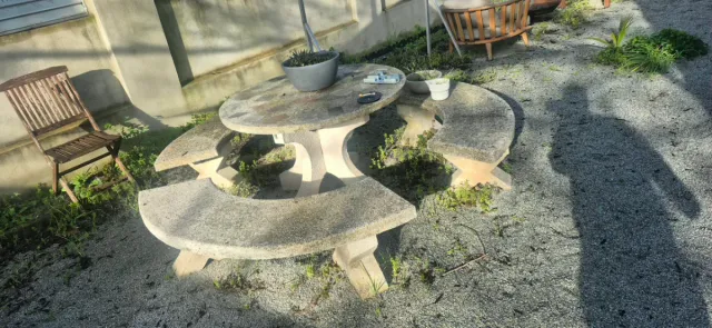 Conjunto de mesa y bancos de piedra para exterior. Ideal para jardines o patios.