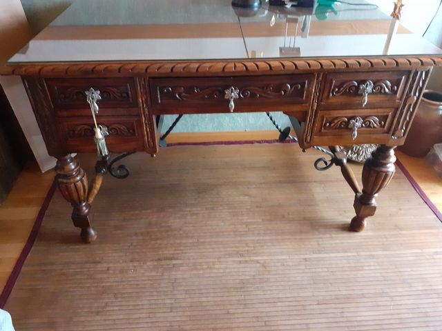 Detalles del productoConjunto de muebles estilo renacimiento español, madera de roble, aquí la mesa tiene cristal encima, con 5 cajones con tiradores de metal, totalmente tallados como el resto de la mesa.