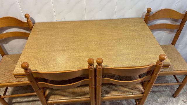 Detalles del productoMesa y cuatro sillas para cocina. La mesa mide 1 metro de largo por 60 ctmos de ancho y se abre a 1,60 Medidas del producto