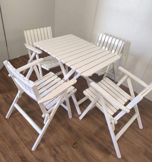 Detalles del productoMesa y sillas blancas de Jardín plegable son de madera la mesa tiene 2 alturas 65 y 73 por 85 de larga y 60 de ancha las sillas 56 de anchas por 75 de altura y 60 de profundidad dispongo de furgoneta y más cosas en mi perfil