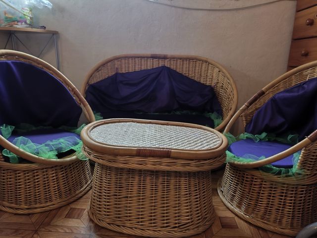 Detalles del productoConjunto de muebles de mimbre, ideal para dar un toque natural a tu hogar. Incluye una mesa auxiliar y dos sillones.