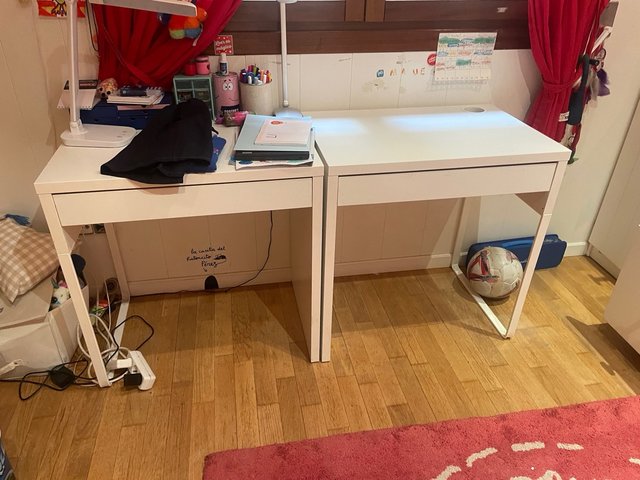 Conjunto de dos mesas de estudio blancas, perfectas para organizar tu espacio de trabajo o estudio.