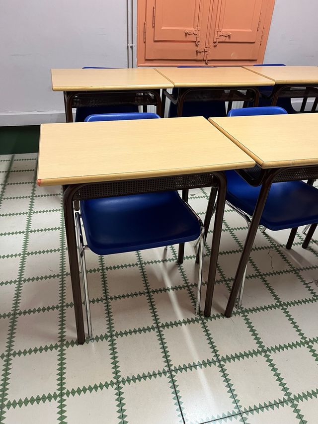 Detalles del productomesas escolares ideales para un aula o espacio educativo. Son de madera clara y tienen un diseño sencillo y funcional. - Se encuentran en buen estado de conservación. - Perfectas para un proyecto de decoración vintage. - Patas de color marrón oscuro. - tienen cesta para libros