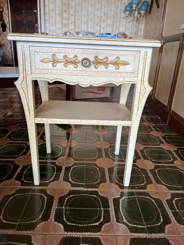Mesilla de noche vintage dorada y blanca