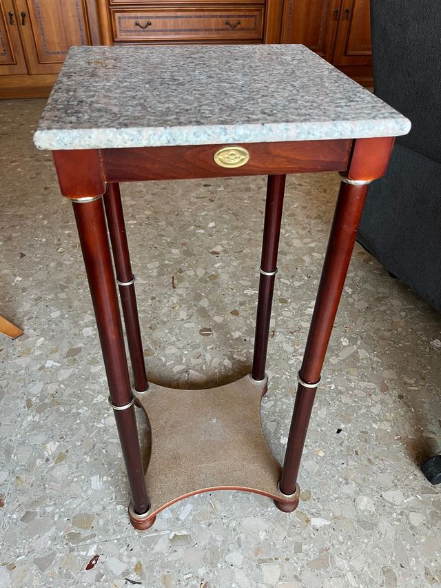 Mesa alta y estrecha con un apoyo de piedra y patas de madera