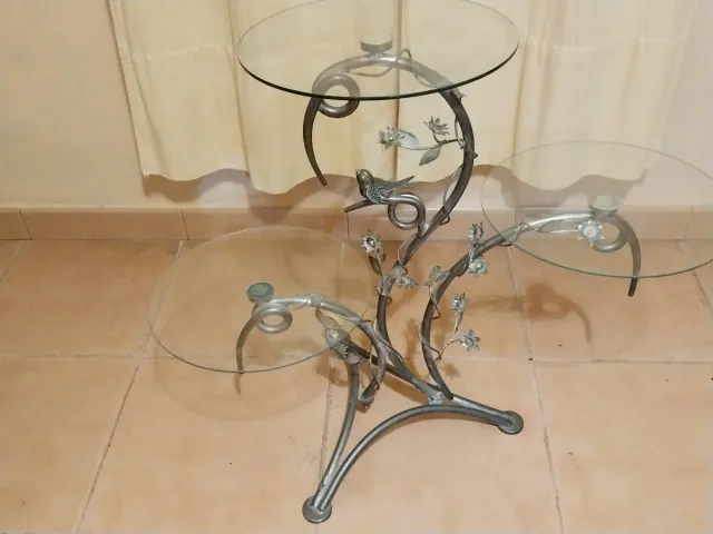 Mesita de cristal y metal con adorno de pájaro
