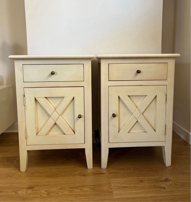 Detalles del productoVendo 2 mesitas de noche de madera maciza, muy resistentes y de estilo rústico-vintage en color blanco roto envejecido.