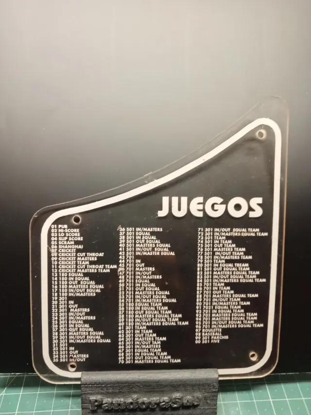 Placa de metacrilato con listado de juegos para diana. - Diseño impreso. - Material: Metacrilato. Precio dependiendo de las necesidades.