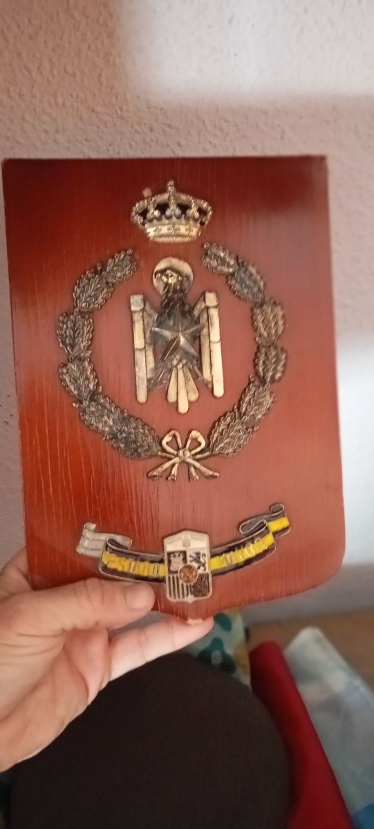- Placa de madera con relieves metálicos.