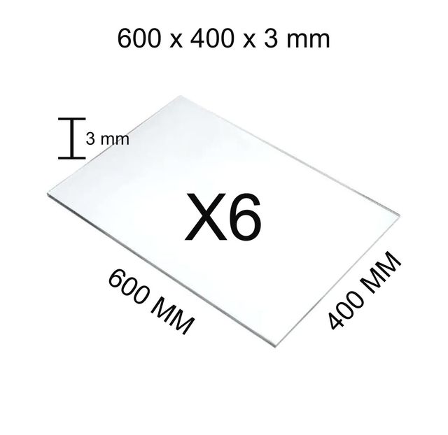 - 6 placas de acrilico 600 mm x 400 mm x 3 mm.
