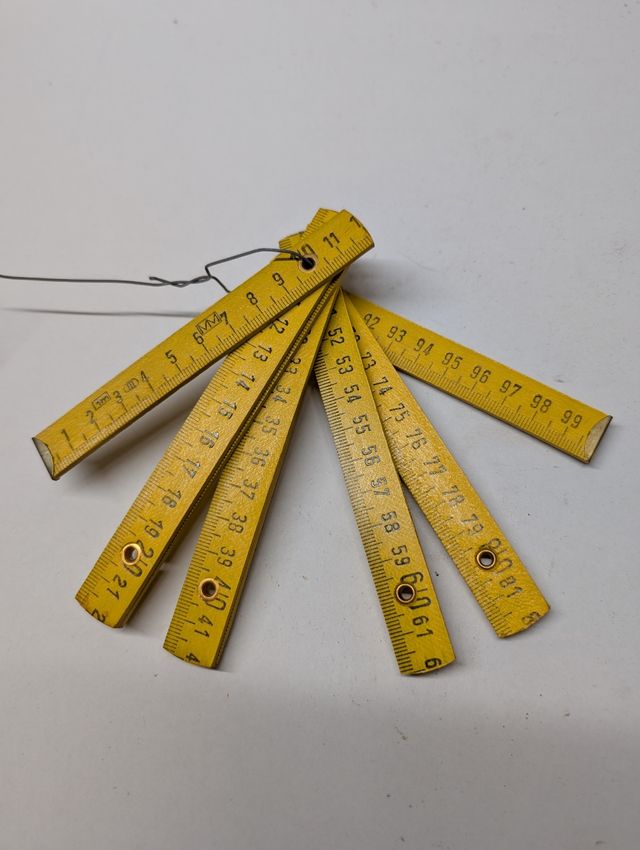 Detalles del productoJuego de diez reglas plegables para carpintero. Son de color amarillo y parecen estar en buen estado.
