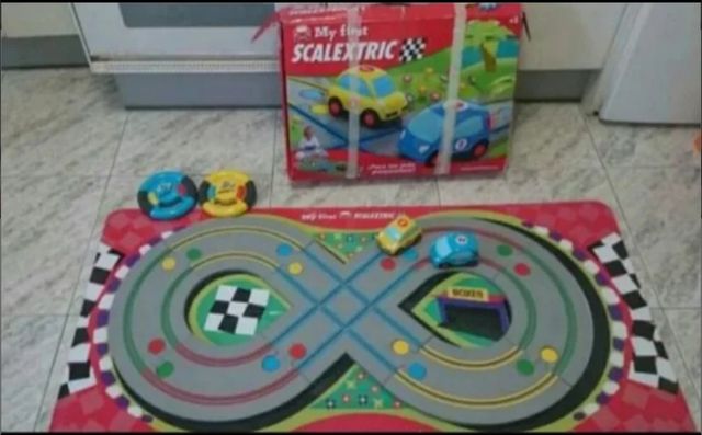 En su caja ! les encantará a los más pequeños. con la pista de carreras y dos coches teledirigidos con los mandos que tiene forma de volantes.