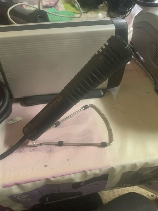 Micrófono de mano con su soporte. - Micrófono de color negro. - Soporte metálico con base triangular.