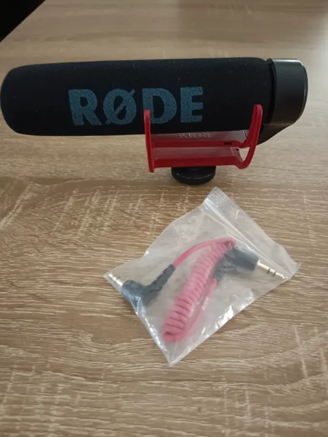 Micrófono Rode con soporte rojo. Incluye cables de conexión. - Antiviento de espuma negra con logo. - Soporte antivibración rojo. - Cables en espiral para conexión.