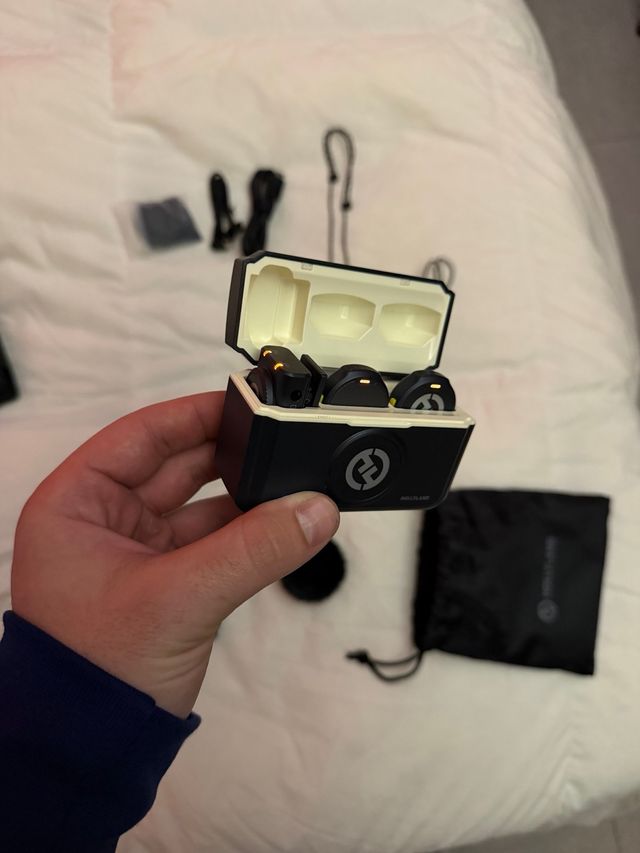 Sistema de micrófonos inalámbricos Hollyland. - Incluye estuche de carga. - Diseño compacto y portátil.