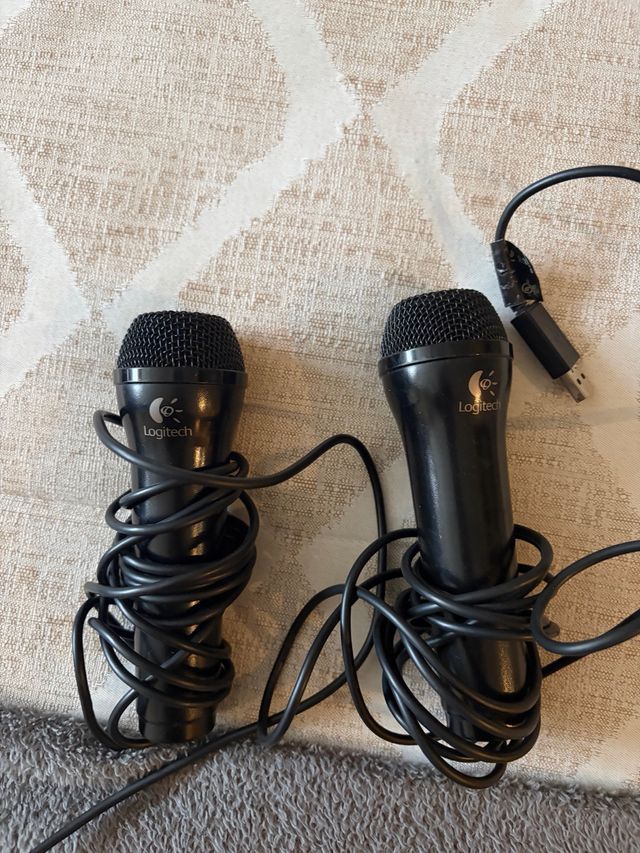 Par de micrófonos negros de la marca Logitech, compatibles con consolas Nintendo Wii. - Diseño ergonómico. - Cableado para conexión.