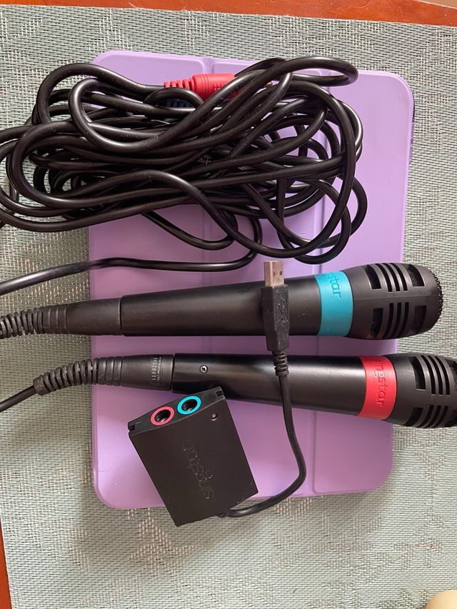Micrófonos para PlayStation 2. - Incluye dos micrófonos. - Conexión USB y jack de audio. - Diseño en color negro con detalles de colores.