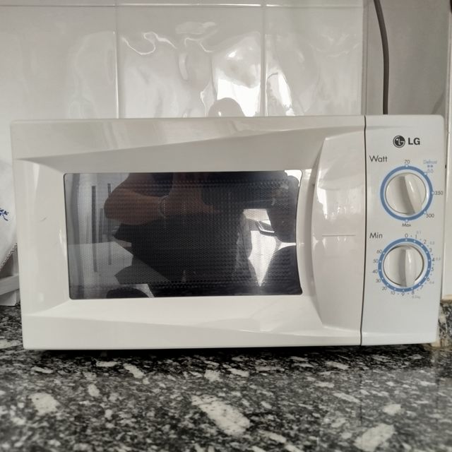 Detalles del productoMicroondas LG en color blanco, con mandos giratorios para ajustar la potencia y el tiempo.