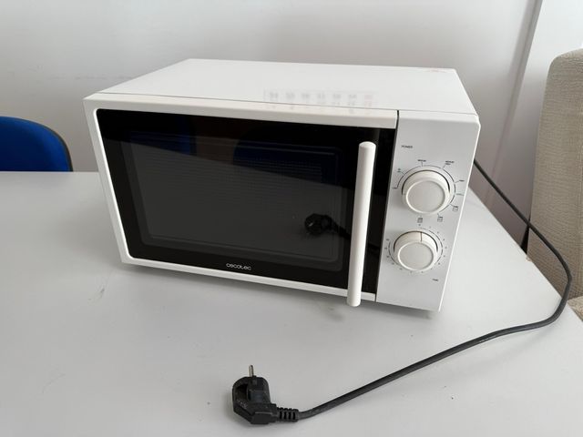 Microondas Cecotec en color blanco de 20l. Diseño moderno y compacto. Sin grill. - Mandos giratorios para potencia y tiempo. - Puerta con cristal. - Asa integrada para apertura.
