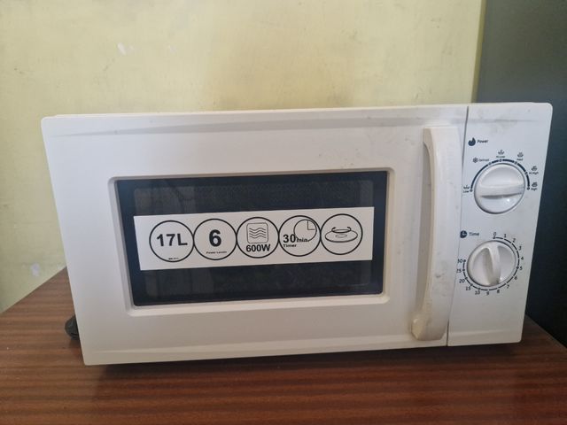 Detalles del productoMicroondas blanco de 17 litros y 600W de potencia. Cuenta con 6 niveles de potencia y temporizador.