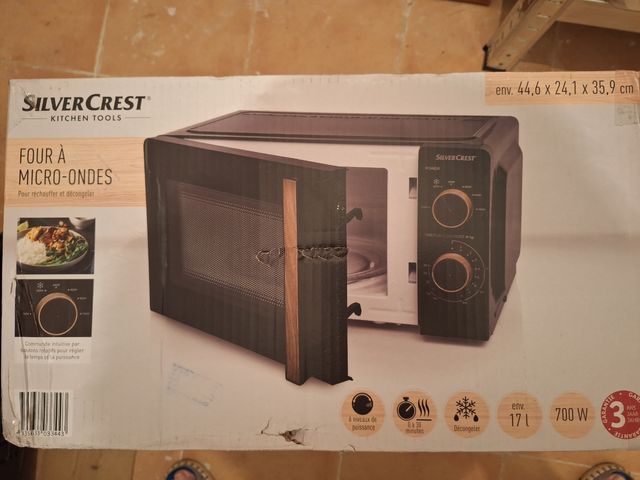 Microondas negro con detalles en madera, nuevo. Sin abrir caja - Capacidad de 17 litros. - Potencia de 700W.