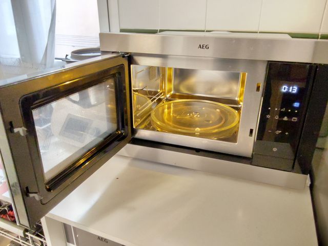 Detalles del productoMicroondas AEG en acero inoxidable integrable, con panel táctil lateral, reloj digital, varias potencias y programas automáticos (descongelar, recalentar, cocción rápida, etc.).