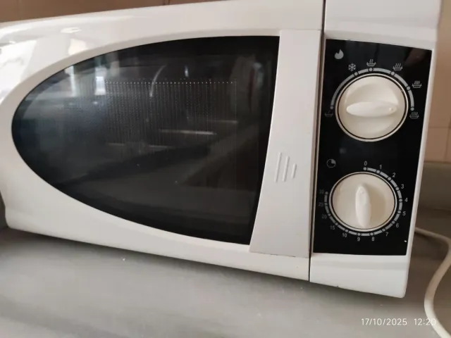 Microondas blanco con mandos giratorios para ajustar la potencia y el tiempo. - Diseño moderno y compacto. - Panel de control intuitivo.