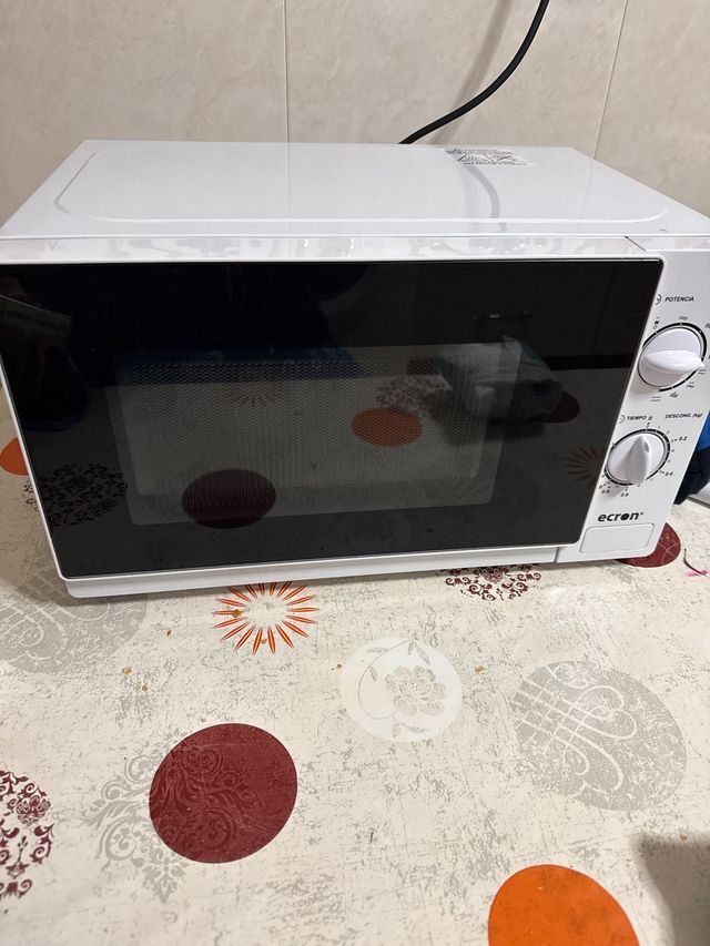 Detalles del productoMicroondas blanco de la marca Ecron, con mandos giratorios para potencia y tiempo.