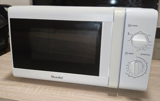 Microondas Bluesky en buen estado. - Modelo compacto y ligero. - Funciones: descongelar, grill y combinadas. - Potencia regulable.