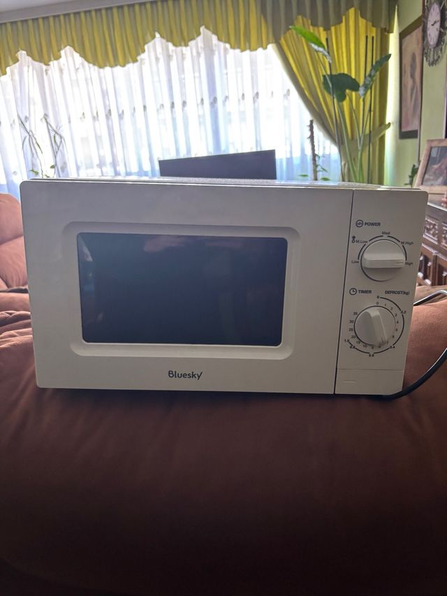 Detalles del productoMicroondas de sobremesa marca Bluesky en color blanco. Cuenta con diferentes niveles de potencia y función de descongelación.