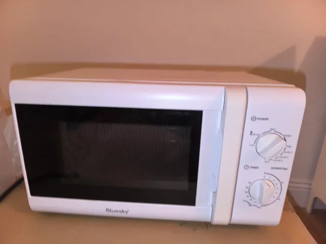 Detalles del productoMicroondas de la marca Bluesky en color blanco.