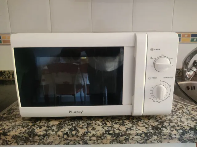 Microondas de la marca Bluesky en color blanco. - Diseño compacto y funcional. - Panel de control con selector de potencia y temporizador. - Función de descongelación.