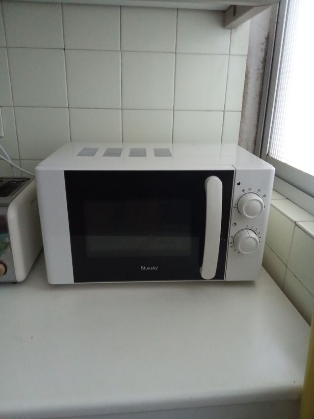 Detalles del productoMicroondas de la marca Bluesky en color blanco.