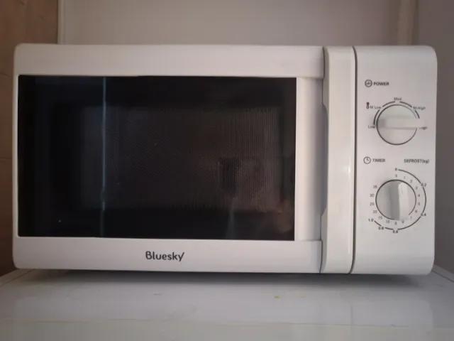 Detalles del productoMicroondas de color blanco de la marca Bluesky. Cuenta con mandos giratorios para ajustar la potencia y el tiempo.