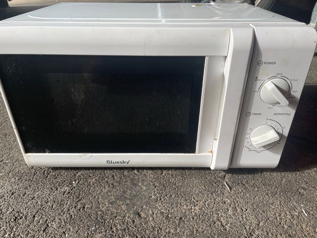 Detalles del productoMicroondas de la marca Bluesky en color blanco. Cuenta con diferentes niveles de potencia y temporizador.