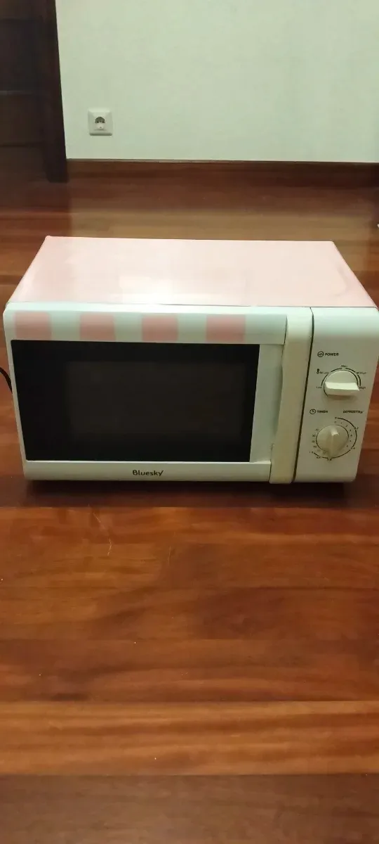 Detalles del productoMicroondas Bluesky en buen estado, con un diseño moderno en blanco y detalles rosas.