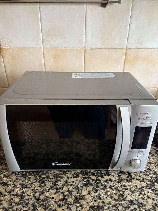 Detalles del productoMicroondas Candy en color plateado, con puerta de cristal, con modos para cocinar