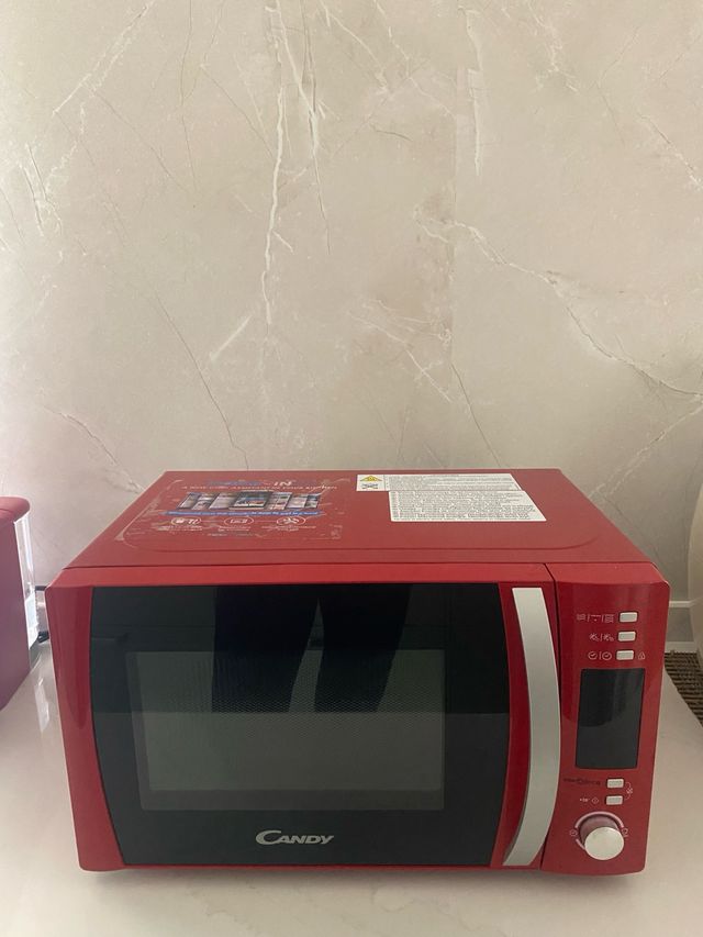 Detalles del productoMicroondas Candy de color rojo con una capacidad de 20 litros y potencia de 700W.